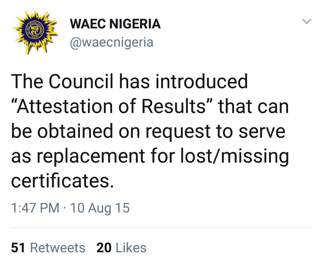 Due to this reason it is now impossible for Candidates who lost or Misplaced their Original Certificate to get a new one, and for this reason the board introduced the issuance of attestation of results where affected candidates are to report to any WAEC Office in the State he or she sat for the examination and apply for “Attestation of Results”.